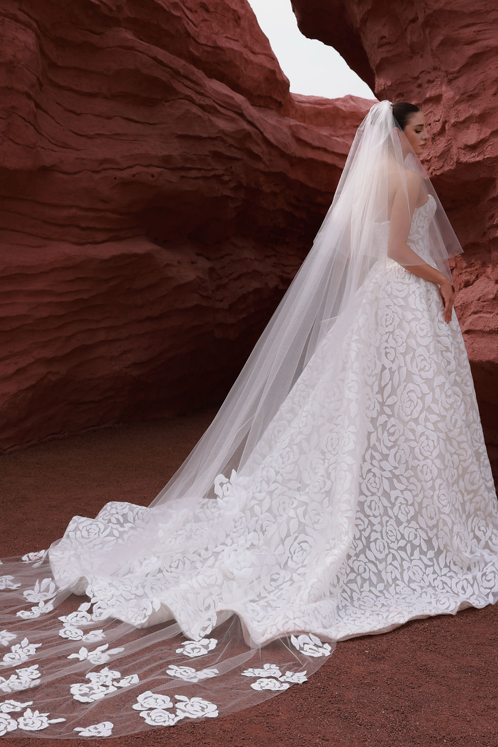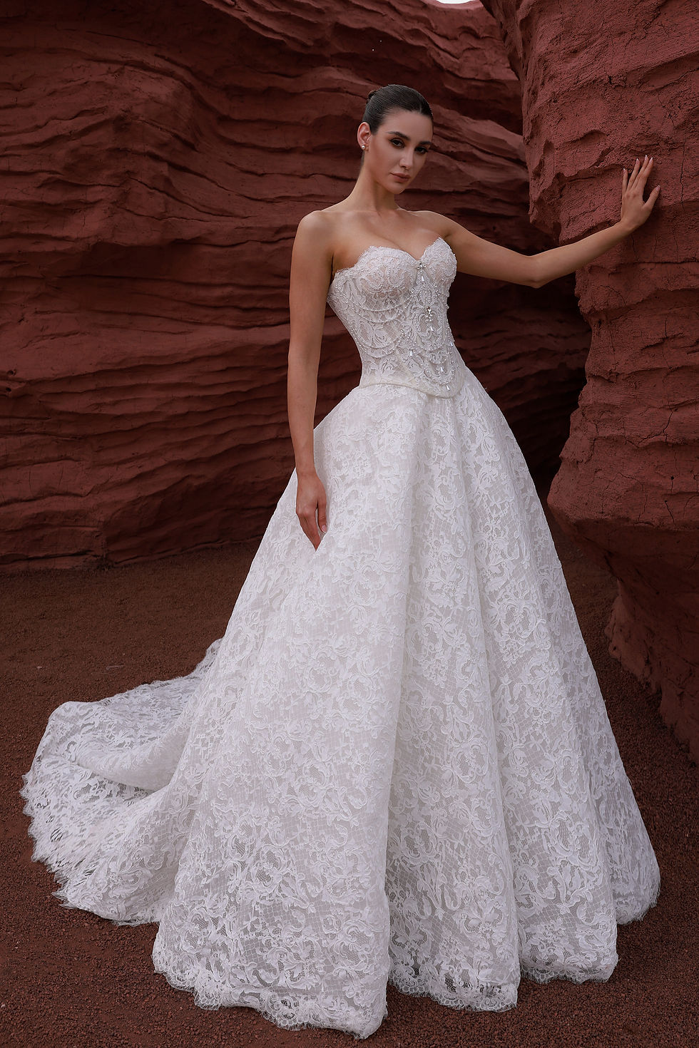 A timeless fusion of romance and elegance, this bridal gown features a delicate lace corset bodice with a sweetheart neckline, flowing into a voluminous lace skirt. The intricate details and sheer gloves add a touch of vintage sophistication, perfect for the modern bride.